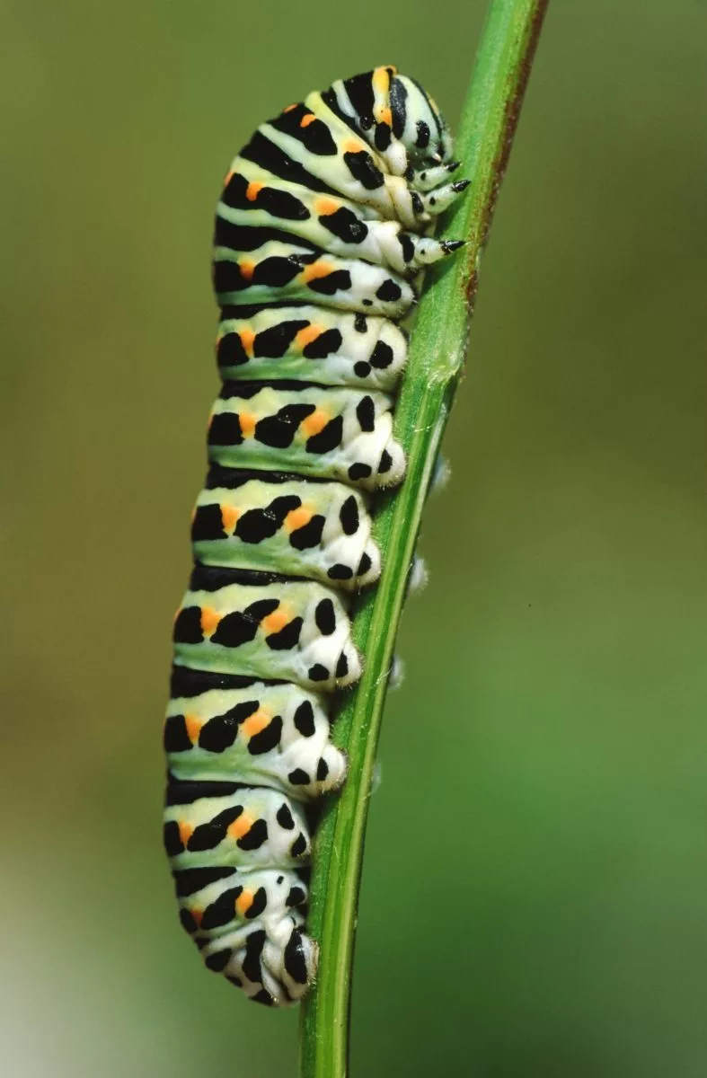 Anfangs zeigen die Raupen Vogelkotmimese (Tarnungsform), demzufolge sind sie schwarz mit orange-roten Punkten. Ausgewachsen sind sie grüngefärbt mit schwarzen Querstreifen und gelben/orangeroten Punkten. Die Raupe kann sich vor Fressfeinden schützen, indem sie die Nackengabel (Osmaterium) unterhalb des Kopfes ausstülpt. Die Nackengabel ist grell orange gefärbt und verfügt über Drüsen, die einen unangenehmen Duftstoff absondern.