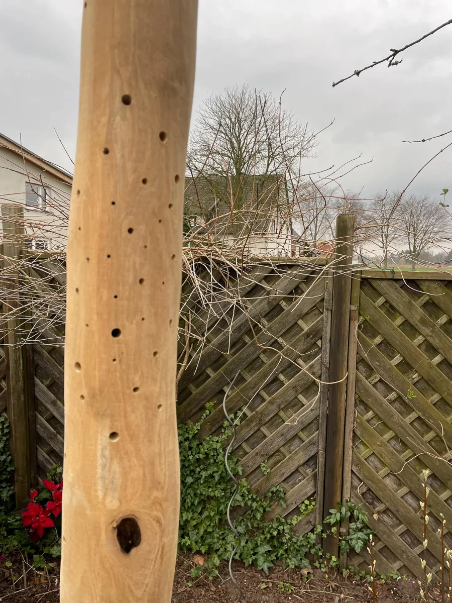 Grundsätzlich kann dazu jedes verfügbare Holz – unabhängig von der Baumart oder dem Trocknungsgrad – verwendet werden. Da die Stelen mit Bohrlöchern versehen werden sollen und es beim Vorbohren auf saubere Bohrlöcher mit fransenfreien Rändern ankommt, empfehlen wir entrindetes, vorgetrocknetes Hartholz (z.B. Robinie, Rotbuche, Esche). Als besonders dekorativ wird von vielen Menschen glatt geschliffenes Stammholz von Robinie – wie es im Spielplatzbau verwendet wird – empfunden.