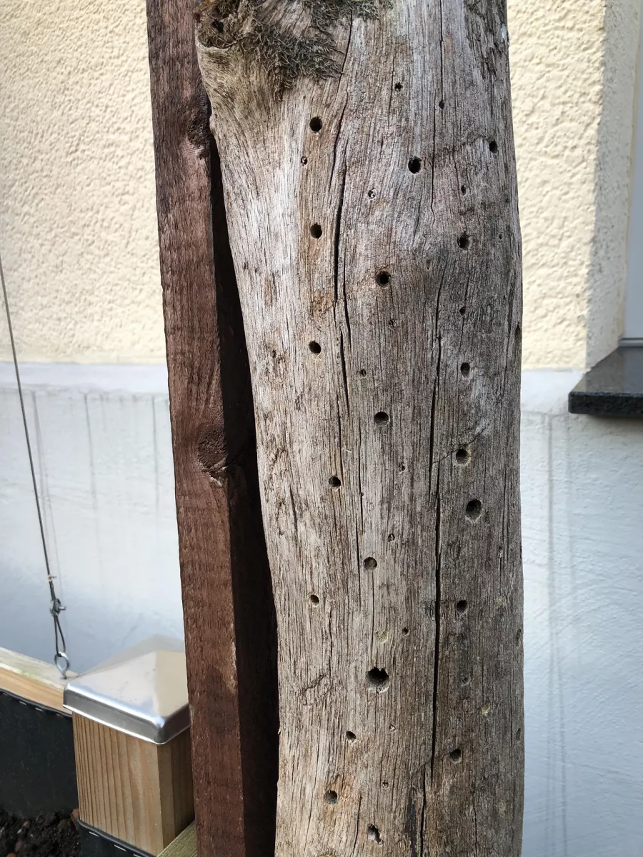 Ein Möglichkeit Nistplätze für Arten anzubieten, die als Sekundärnutzer in die Fraßgänge totholzbewohnender Käferarten einziehen, stellen Stelen aus Stamm- oder starkem Astholz dar.