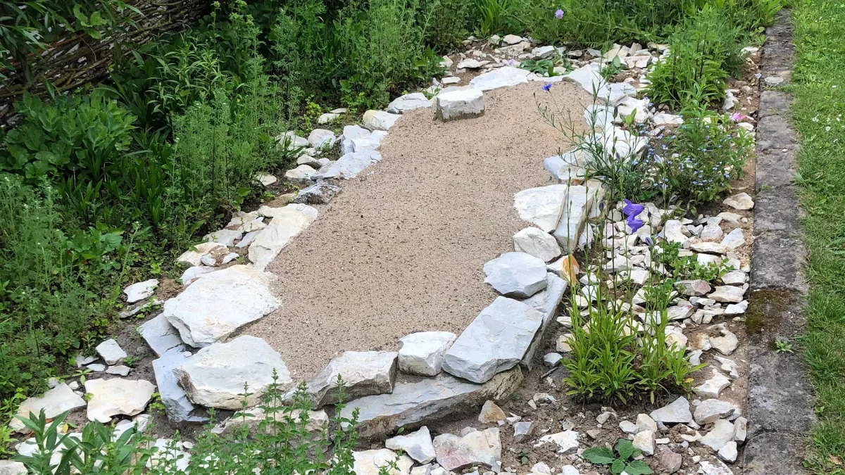 Zur Förderung kalk- und trockenheitsliebender Pflanzenarten kann ein bepflanzbares Schotterbeet angelegt werden.