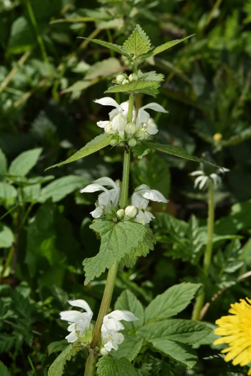 Auffällig ist ihre lange Blütezeit: Von Frühling bis in den Herbst hinein kann die Weiße Taubnessel neue Blüten bilden. Diese sind in Scheinquirlen um den Stängel angeordnet und besitzen die für Lippenblütler typische zweilippige Form. Die große, helmförmige Oberlippe schützt die Fortpflanzungsorgane vor Regen, während die Unterlippe als „Landeplatz“ für Insekten dient.